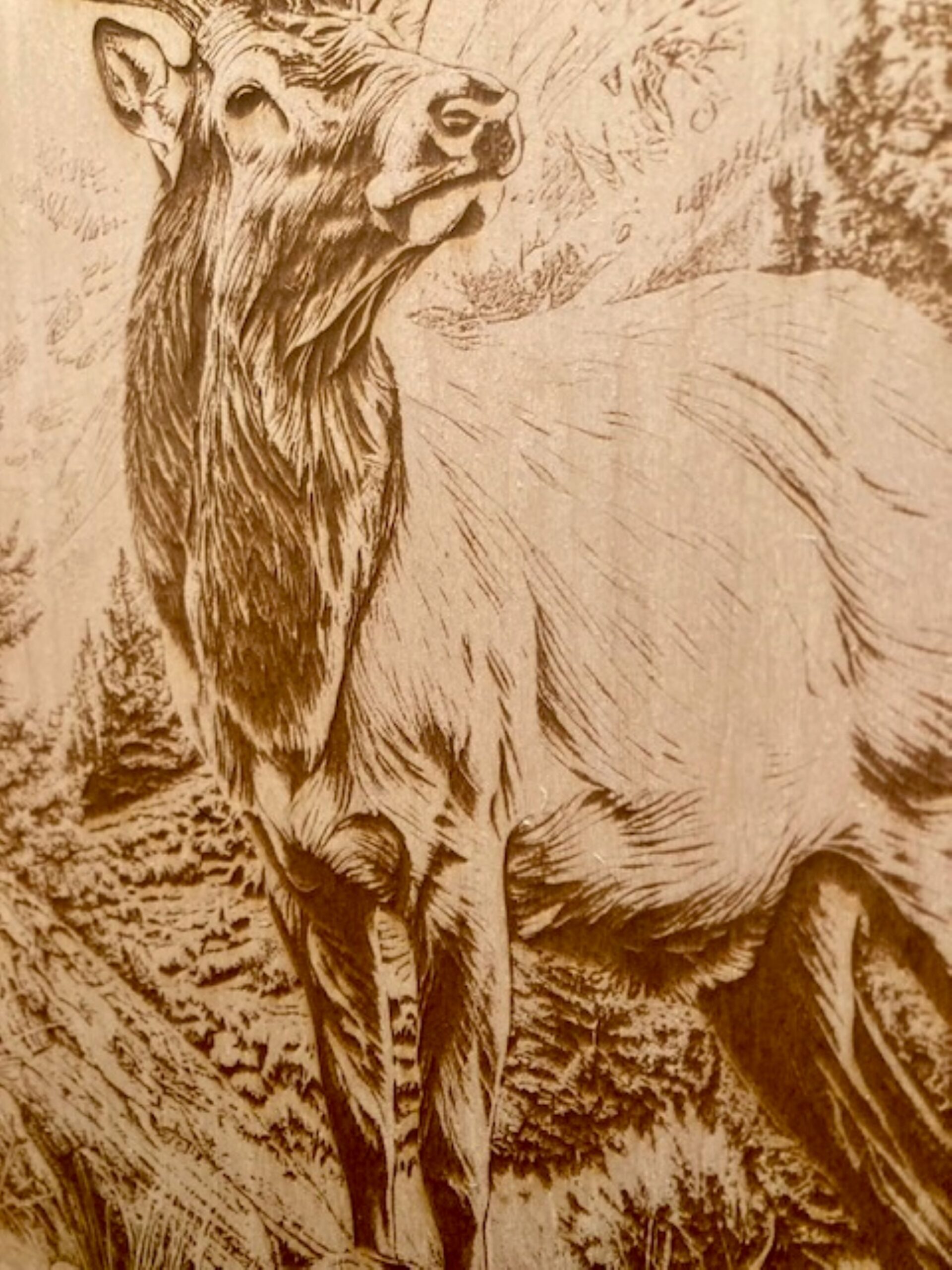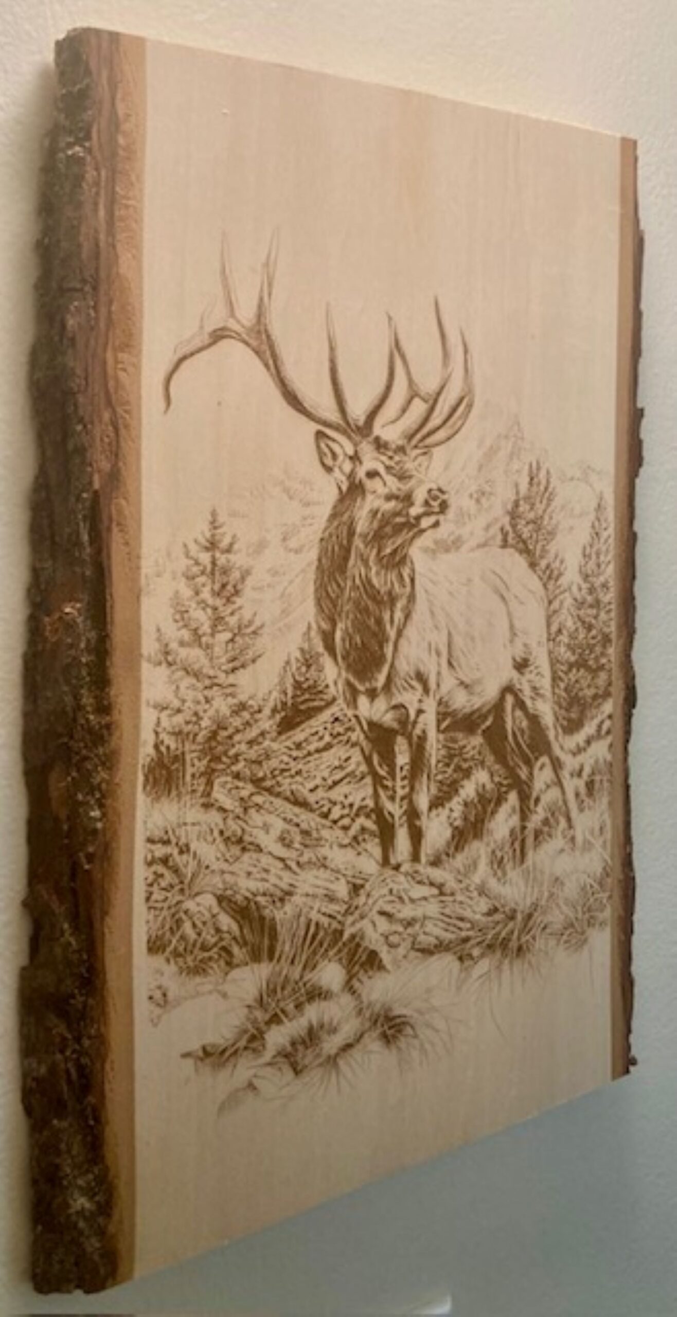 Crafted from a solid natural wood plank with live edges, this handmade laser engraved artwork captures the strength and majesty of one of North America’s most iconic animals. The elk design is permanently burned into the wood, allowing the natural grain, knots, and live edges to enhance the character of each piece. Every board is carefully selected and engraved, making each plank truly unique.